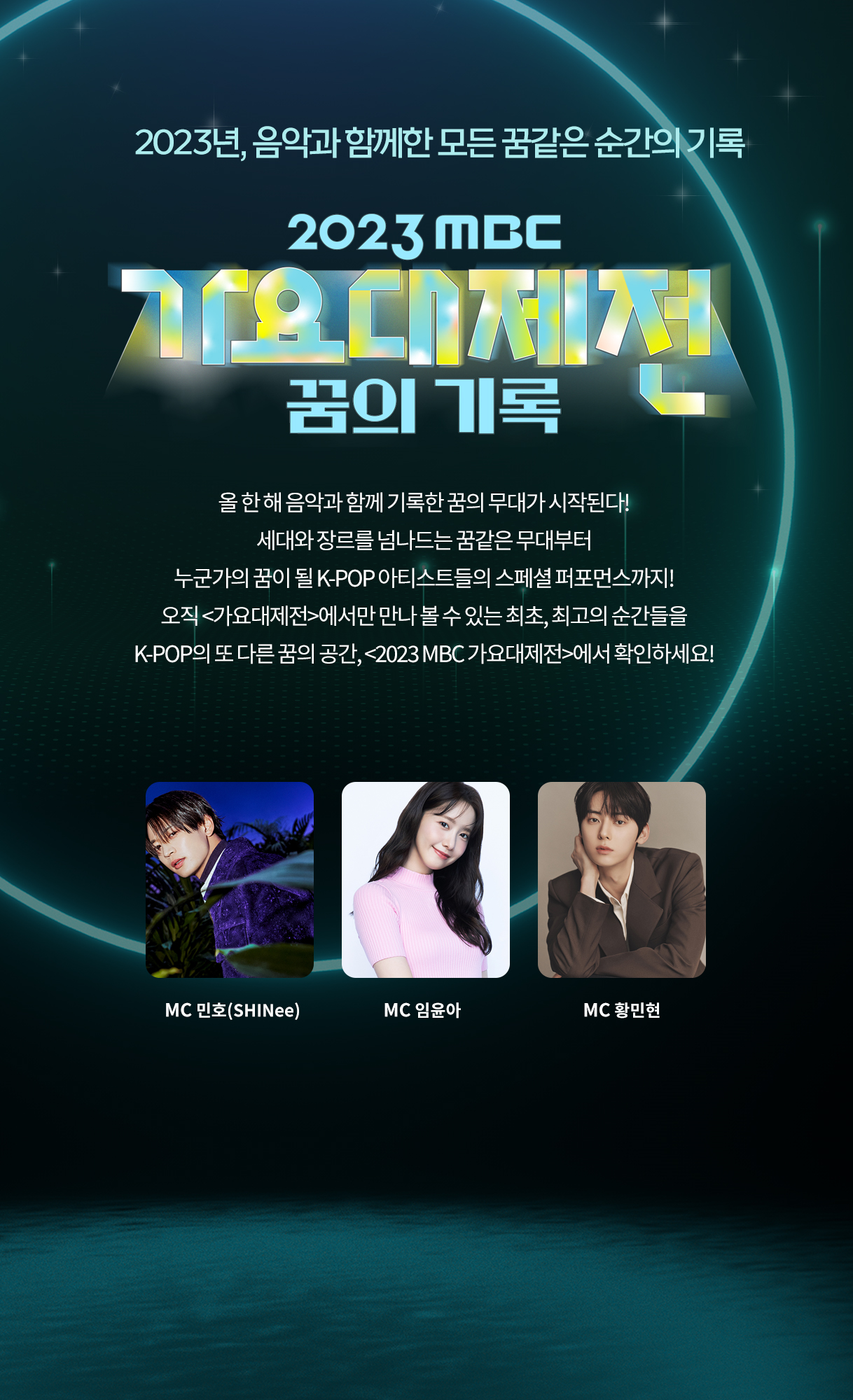 '2023 MBC 가요대제전'은 오는 31일 오후 8시 30분에 생방송 될 예정이며 티저영상을 통해 완벽한 한 해의 마무리와 시작을 장식한 노래를 들으며 무대 위에서 열창하는 자신의 모습을 상상했다는 임윤아, 민호, 황민현의 말이 묘한 감동을 선사합니다. 과연 시청자들의 꿈을 부풀어 오르게 할 ‘2023 MBC 가요대제전 꿈의 기록’이 보여줄 K-POP 최초, 최고의 순간들은 무엇일지 2023 MBC 가요대제전에 관심이 모아집니다.