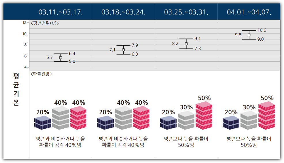 (주평균기온) 평년(9.0~10.6℃)보다 높을 확률이 50%입니다.