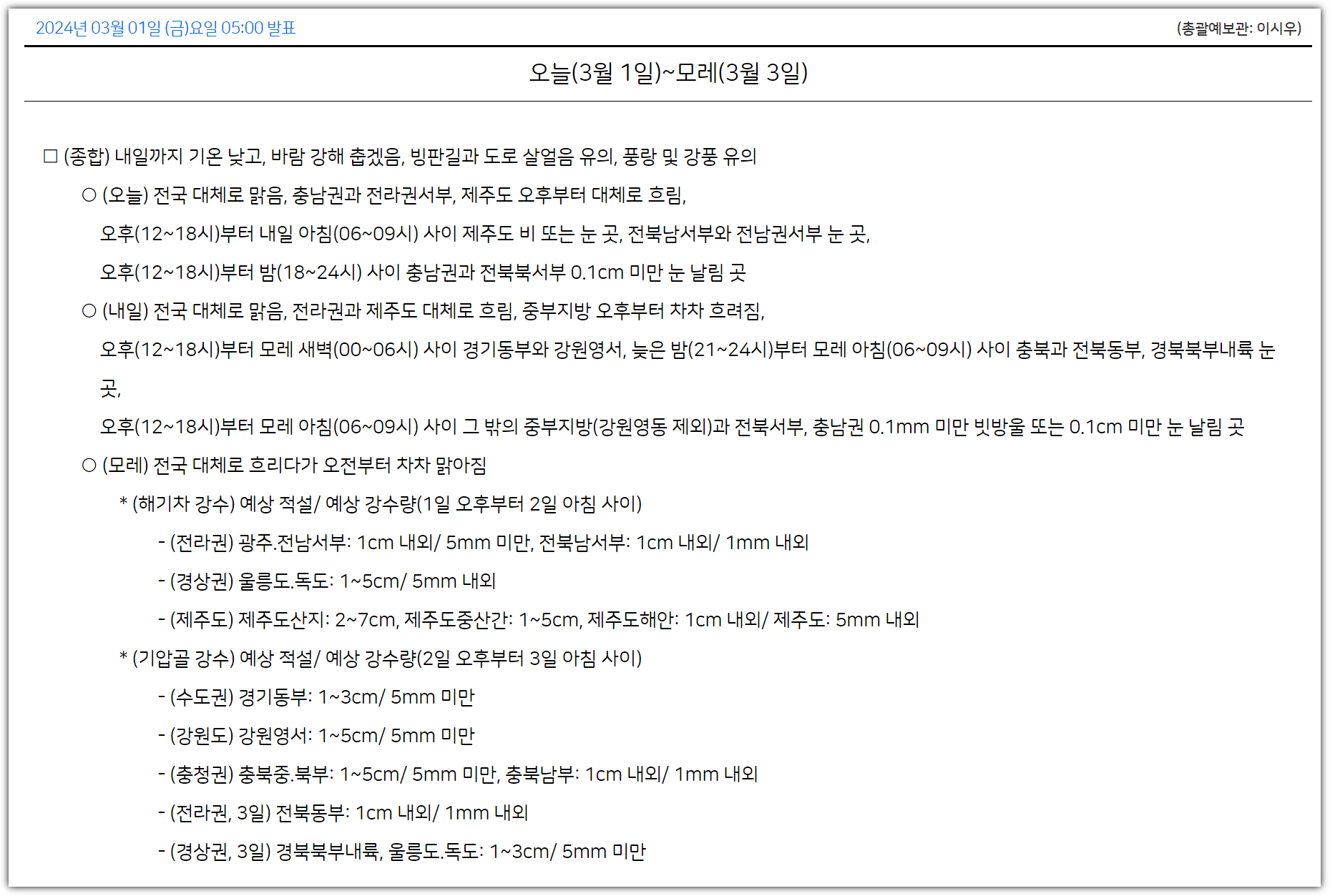 ■ 3월 1일 ~ 2일 날씨 전망