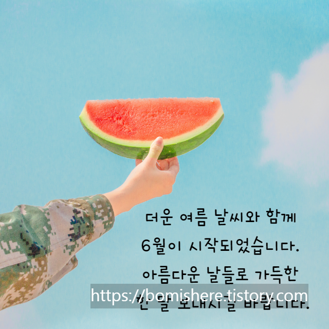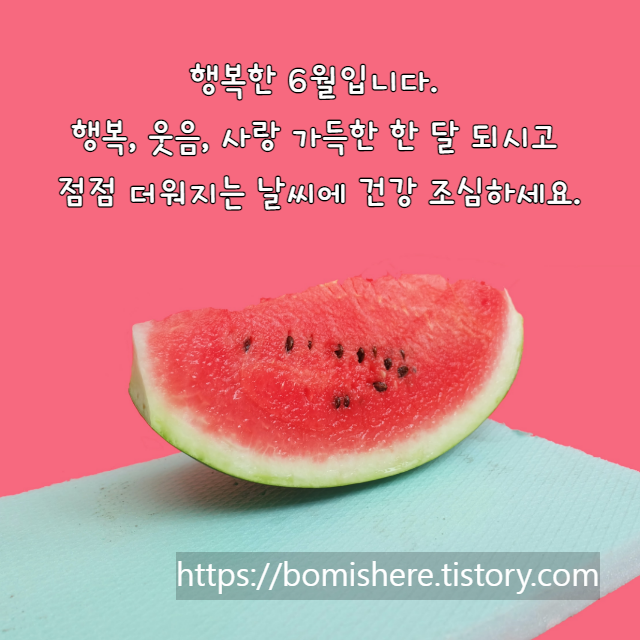 더운 여름 날씨와 함께 6월이 시작되었습니다. 아름다운 날들로 가득한 한 달 보내시고 행복, 웃음, 사랑 가득한 날들 되시기 바랍니다.