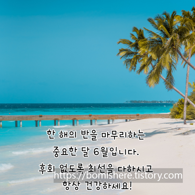 한 해의 절반을 마무리하는 6월입니다. 새해의 계획을 점검해 보기에 좋은 시기인데요, 후회는 조금만 하시고 남은 절반을 위해 힘내세요. 행복한 하루 보내시길 바랍니다.