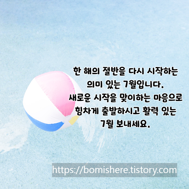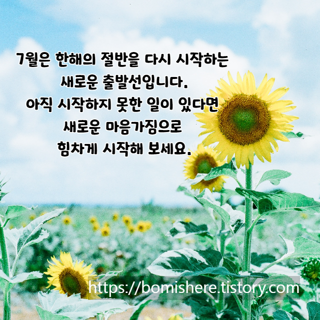 1. 어느덧 한해의 절반이 지나가고 새로운 시작 7월을 맞았습니다. 새로운 희망으로 행복이 가득한 7월 되시길 바라며 항상 행복하세요.