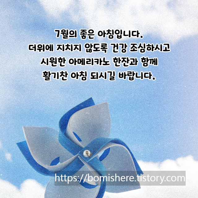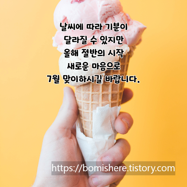 4. 아침에 눈 뜨자마자 더운 날씨가 느껴지는 7월입니다. 올해 유난히 더운 여름이 될 것이라고 해요. 몸 잘 챙기시면서 7월 한 달 건강히 보내세요.