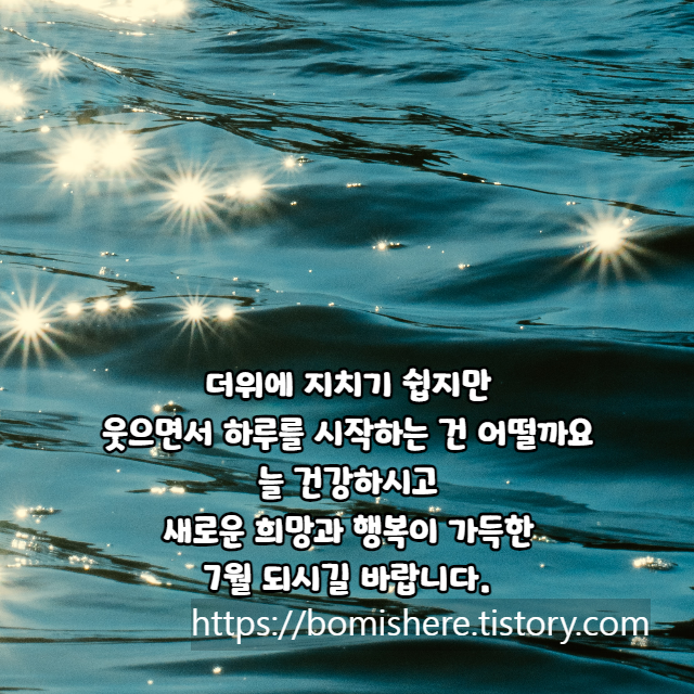 1. 어느덧 한해의 절반이 지나가고 새로운 시작 7월을 맞았습니다. 새로운 희망으로 행복이 가득한 7월 되시길 바라며 항상 행복하세요.