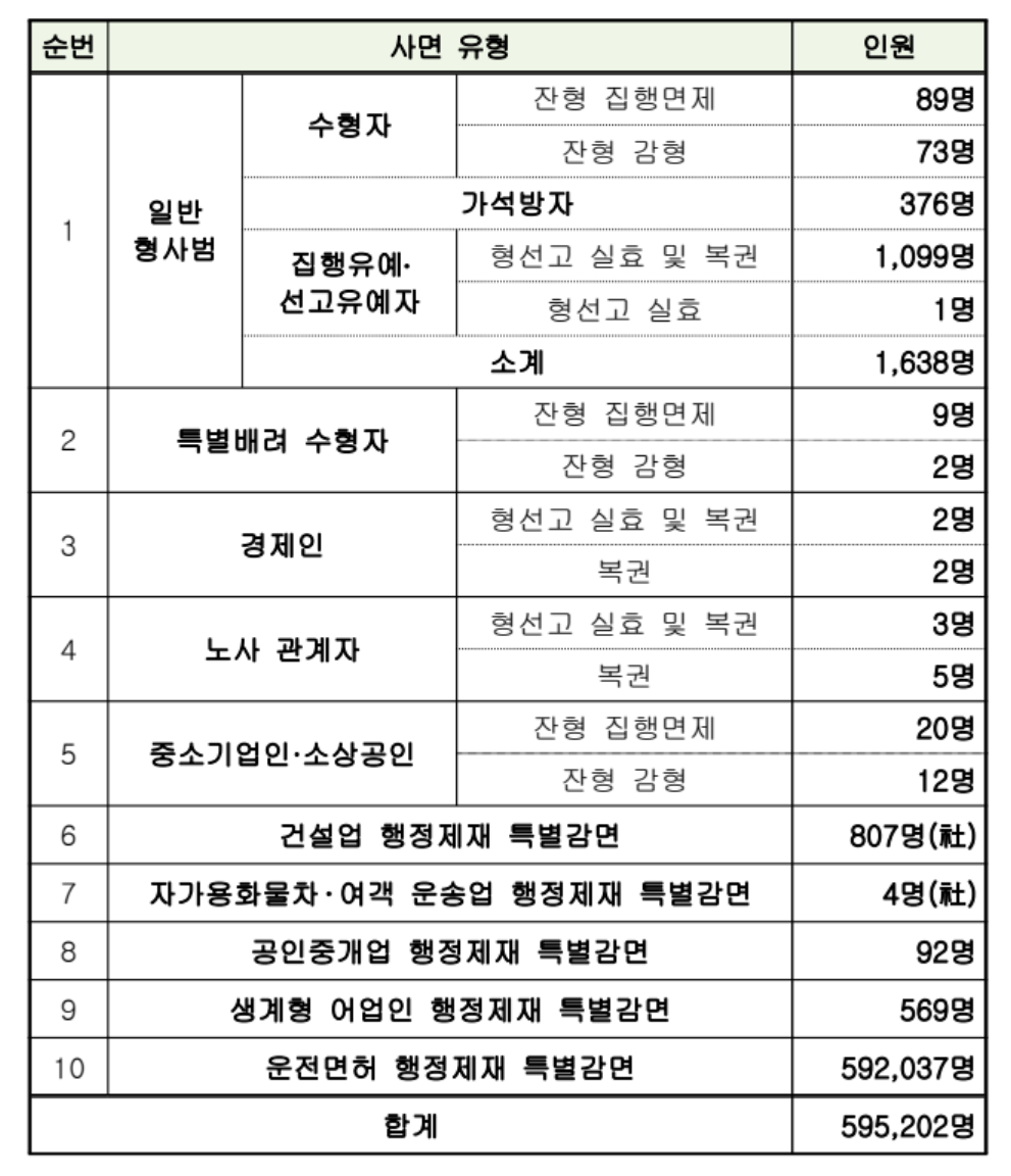 더불어 영업악화 등으로 범죄에 이른 중소기업인, 소상공인 32명, 살인·강도 등 강력사건을 제외한 재산범죄 위주의 일반형사범 1638명과 운전면허 취소자 등 행정제재 대상자 59만2037명도 특별감면 조치를 받았는데요, 정치인과 공직자는 배제됐습니다. 815광복절 음주운전 특별사면 (광복절 특사 명단 확정판)을 좀 더 자세히 알아보도록 하겠습니다.