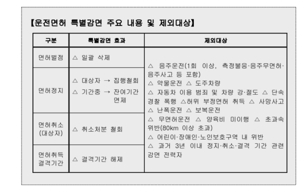 • 적용기간 내 행위로 운전면허 정지처분이 집행 중이거나 절차가 진행 중인 자(3437명) : 남아 있는 정지 기간의 집행이 면제되거나 정지 절차가 중단, 오는 15일부터 바로 운전 가능, 평일 일과 중 해당 경찰서 민원실을 방문하게되면 본인의 면허증을 반환받을 수 있음