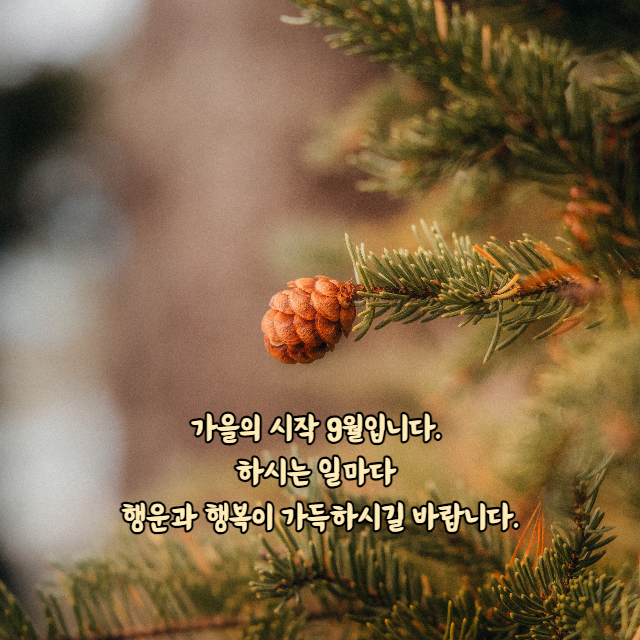 9월이 되어서인지 서늘해지는 가을이 어느덧 우리 곁에 성큼 다가온 것 같습니다. 다가오는 새로운 계절에도 새로운 마음가짐으로 계획한 일 잘 이루시어 기쁨의 결실을 많이 맺으셨으면 좋겠습니다. 오늘도 행복한 하루 보내세요.