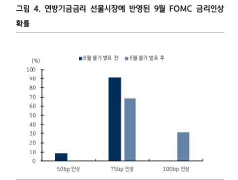지난 13일에 8월 미국 소비자물가지수(CPI)가 발표됐는데 전년 동월 대비 8.3% 상승, 시장 전망치인 8%를 상회하기도 했기 때문에 미국의 인플레이션이 아직도 심각한 상황이라고 볼 수 있는건데요, 이 때문에 시장에서는 연준이 9월 FOMC에서 3연속 자이언트 스텝(기준금리 0.75%포인트 인상)을 단행할 것이라는 전망이 우세한 상황입니다. 일부는 역사상 유례가 없는 울트라스텝(1%포인트 금리 인상)을 밟을 수 있다는 전망도 나옵니다.