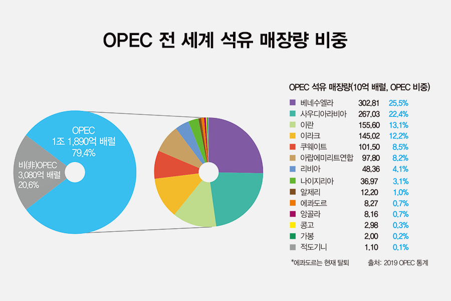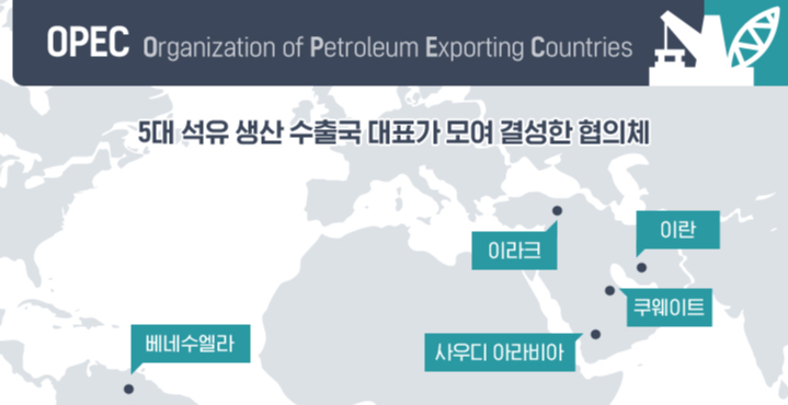 먼저 OPEC은 석유수출국기구를 말하며 1960년 결성됐습니다. 현재 13개국이 회원국(사우디아라비아, 쿠웨이트 등 걸프만 국가들과 베네수엘라, 나이지리아 등 비중동권 산유국)인데요, 이들은 1970년대 석유감산 조치로 글로벌 '오일쇼크'를 야기해 존재감을 과시한 바 있습니다.