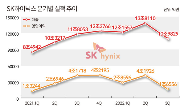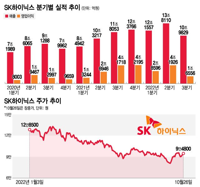 컨센서스에 따르면 SK하이닉스의 4분기 영업이익이 1349억원으로 작년 4분기(4조2195억원)와 직전 3분기(1조6556억원) 대비 급감할 것이란 전망인데요, 만약 4분기에 적자로 돌아서면 분기 기준으로 영업손실 150억원을 기록한 2012년 3분기 이후 10년 만의 실적 부진이라고 볼 수 있습니다.