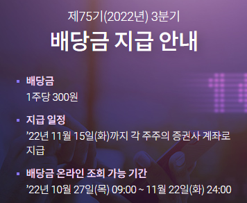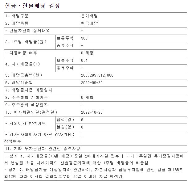SK 하이닉스 배당금은 기본배당금 1200원을 분기마다 지급한다는 말인데요, 매달 300원의 배당금이 나오는 것이며 지난 2022년 9월 분기배당금이 공시된 바 있습니다.