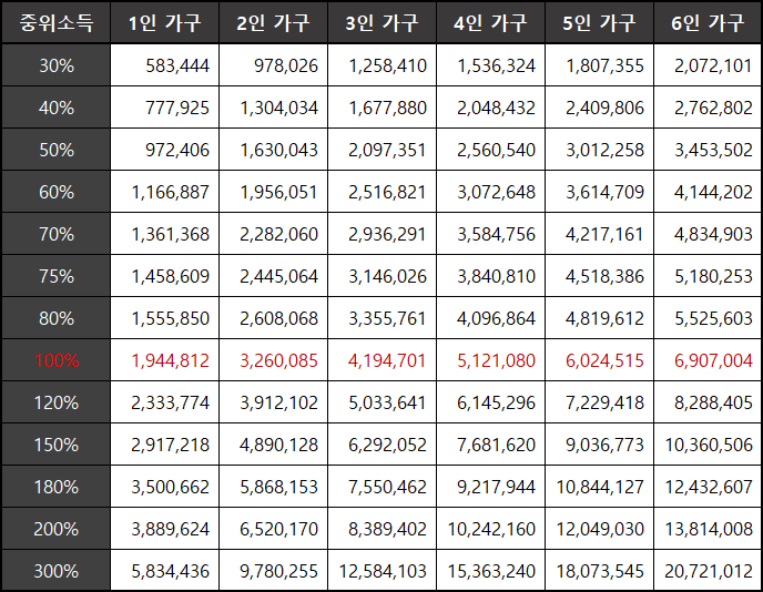 여기서 중위소득 60%와 120%의 구체적인 금액이 얼마인지 궁금하실텐데요, 2022년 가구원수별 기준 중위소득 60%는 3인 가구가 251.6만 원, 4인 가구가 307.2만 원이라고 합니다. 반면 120%는 3인 가구가 503.3만 원, 4인 가구가 614.5만 원이라고 하니 참고하시면 될 것 같아요.