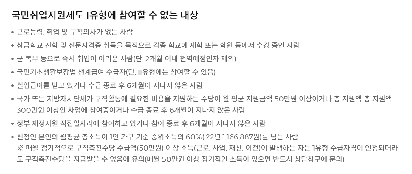 국민 취업지원제도 1유형 대상자 기준을 충족하더라도 제외 대상에 포함되면 지원을 받지 못합니다.