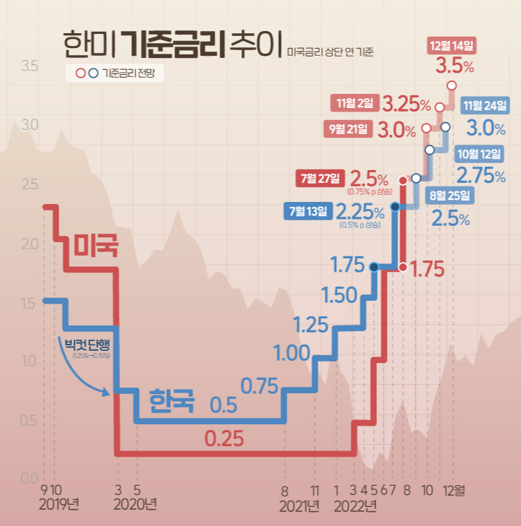 지난달 27일 미연준이 FOMC 정례회의에서 두 달 연속 '자이언트 스텝'을 밟은 뒤 미국의 기준금리(2.25∼2.50%)가 한국(2.25%)보다 높아진 상황인데요, 이 때문에 한은으로서는 기준금리 인상으로 격차를 좁힐 수 밖에 없다고 볼 수 있습니다. 2022년 8월 기준금리 인상 전망에 대한 이유를 좀 더 자세히 알아보도록 하겠습니다.