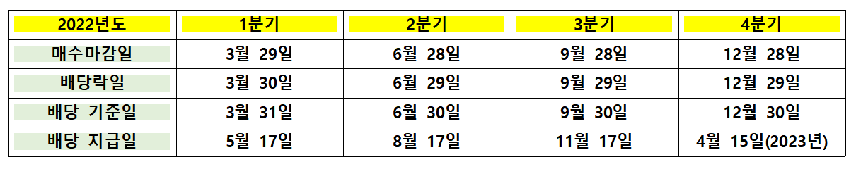 예) 삼성전자 2022년 1분기 배당금을 받으려면 3월 31일까지는 삼성전자 주식을 보유해야 하고 3월 29일까지는 삼성전자 주식을 매수해야 합니다.