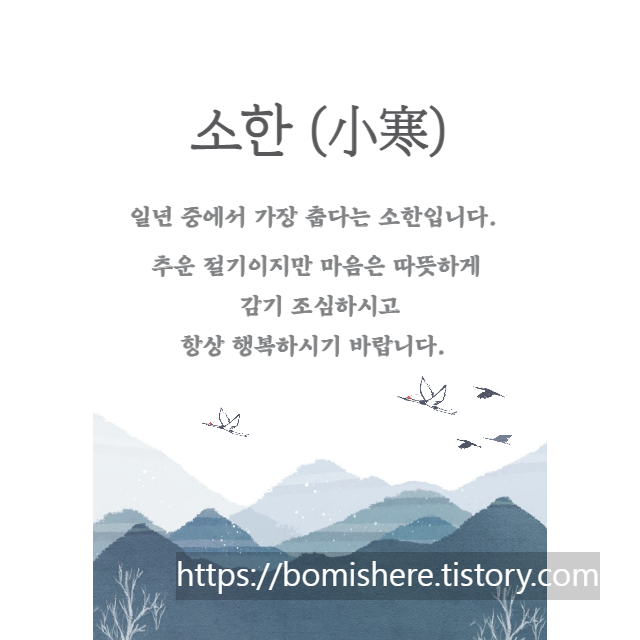 ※ 소한 인사 이미지 (아침 인사말)은 무료 이미지를 활용하여 직접 제작하였습니다. 주변분들과 인사 나누시는데 사용하시는 것은 좋지만 개인 블로그나 카페로 허락없이 가져가실 경우 엄중히 조치하도록 하겠습니다.
