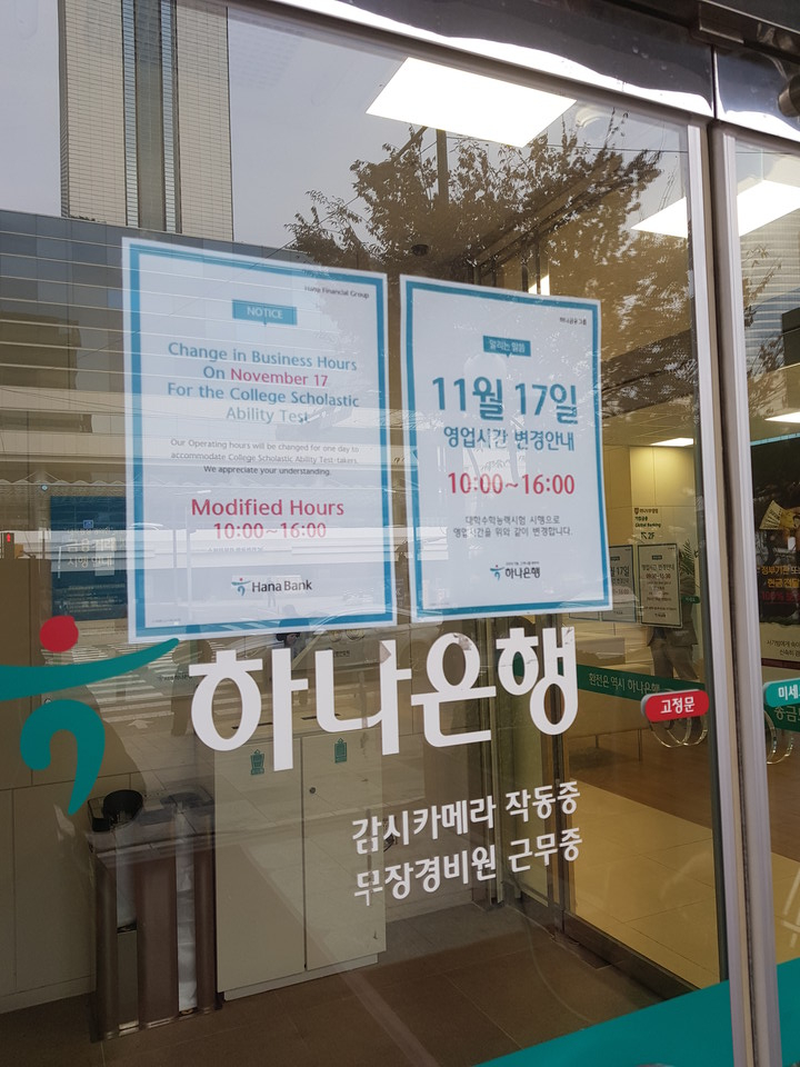 그 밖의 은행 업무시간은 시험일(17일)에 한해 10:00~16:00로 변경된다고 보시면 될 것 같습니다. 이는 시험일 아침 수험생, 감독관, 학부모 등의 이동으로 교통 수요가 급증할 것으로 예상돼 은행 영업시간을 조정하는 것이라고 하네요.