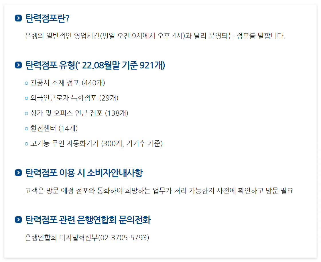 이처럼 은행 단축운영이 계속되는 상황에서 비대면 거래가 확대되고 은행권 영업지점 통폐합이 가속화되면서 영업점 찾기조차 쉽지 않은 상황이 발생하고 있습니다. 게다가 이를 미처 인지하지 못한 고객들이 은행을 찾았다 발걸음을 돌리는 경우까지 발생해 불편하다는 목소리도 커지고 있는데요, 이 때문에 일부 은행에서는 최근 특화점포 및 탄력운영제 등을 도입하여 은행 영업시간 단축운영의 불편함을 해소하고자 변화를 시도하고 있습니다. 이를 좀 더 자세히 살펴보도록 하겠습니다.