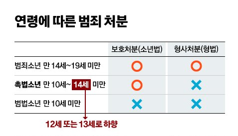 즉, 10~14세는 만약에 일을 저질렀을 경우에는 형법상에는 책임이 주어지지 않지만 10세가 넘으면, 쉽게 말해 소년원에 보낼 수 있는 것이구요, 14세 이후부터는 법원의 결정에 따라서 소년원 또는 형사처벌 여부가 결정되는 것입니다.